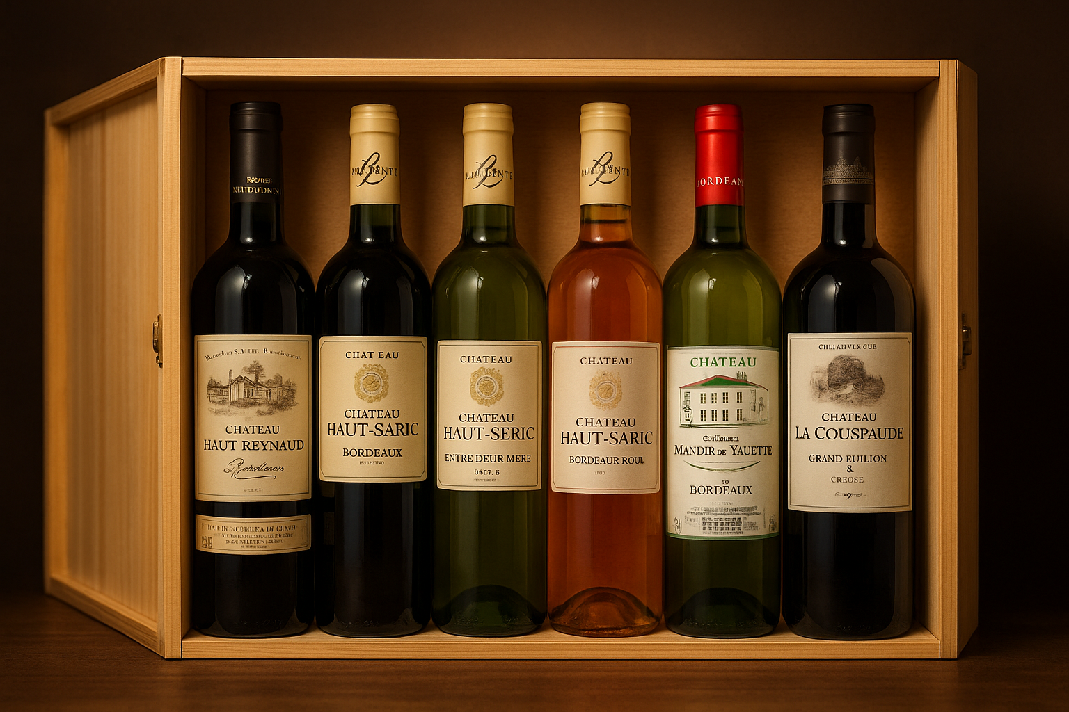 Sélection exclusive de Bordeaux d’exception, millésimes reconnus pour leur équilibre et leur potentiel de garde.  Présentation en caisse bois haut de gamme (supplément 6 €).  Contenu : 6 bouteilles parmi Château La Couspaude, Margaux, Pessac-Léognan, Saint-Émilion Grand Cru.  Coffret limité, destiné aux amateurs de crus prestigieux.